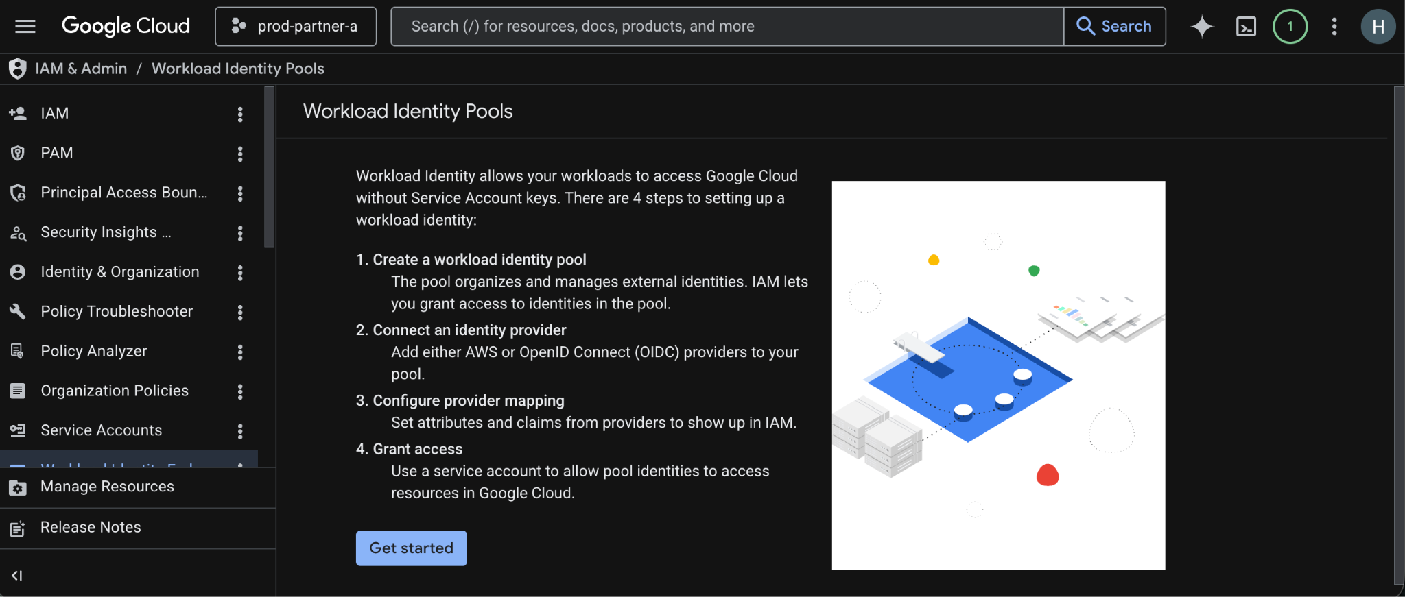 Navigate to the Workload Identity Federation dashboard. You can also use the search bar at the top of the page or by opening the hamburger menu in the upper right and going to the IAM & Admin tab, and then finding Workload Identity Federation in the menu that appears.
